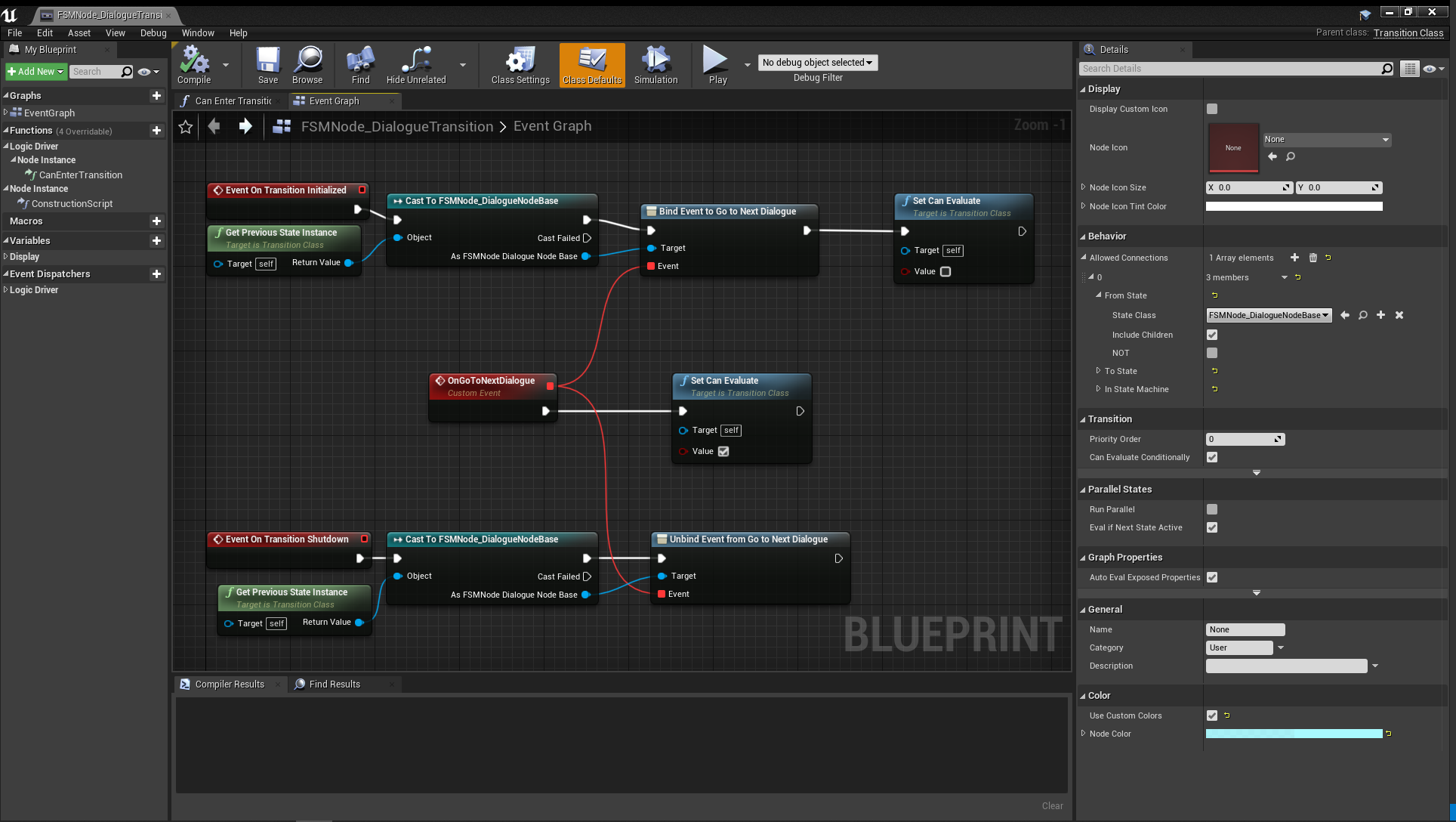 FSMNode_DialogueNodeBaseand bind to the event dispatcher we created earlierGoToNextDialogue. Make sureSetCanEvaluateis set to false on Initialize, and set to true when the event is called. - In the class defaults, add a behavior rule under