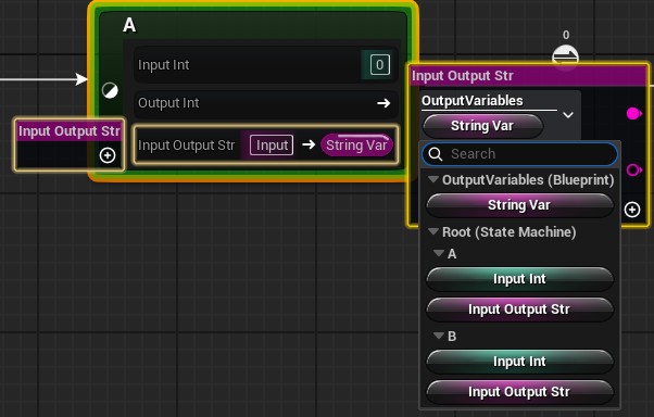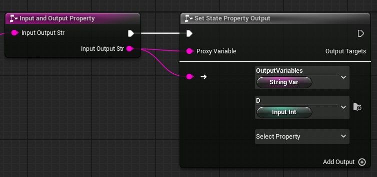 On the right, we have Set State Property Output. This is what the state is writing to. This special node allows us to select either state variable inputs, or owning state machine variables.